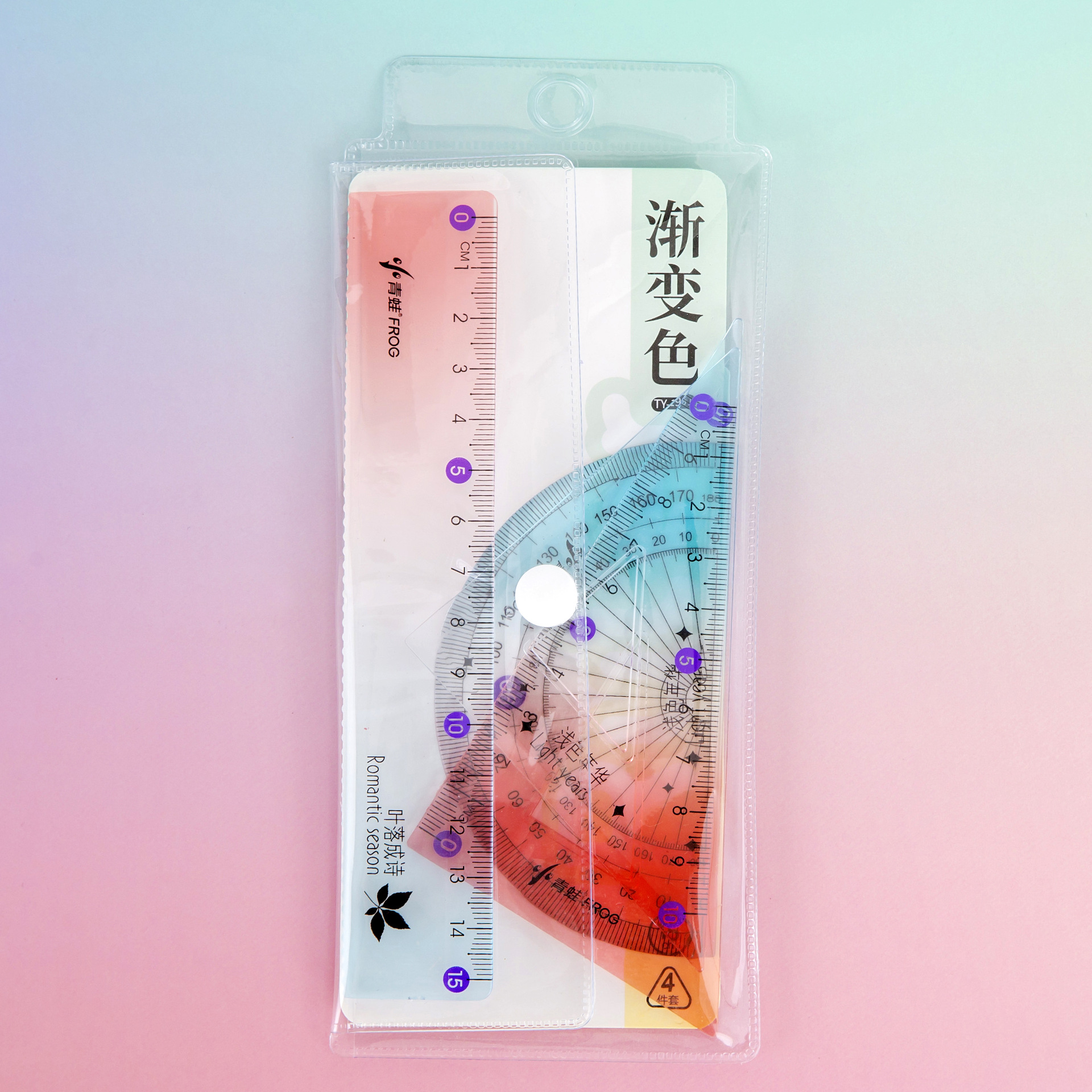 渐变色套尺学生学习文具直尺四件套时尚简约三角双色渐变透明尺子