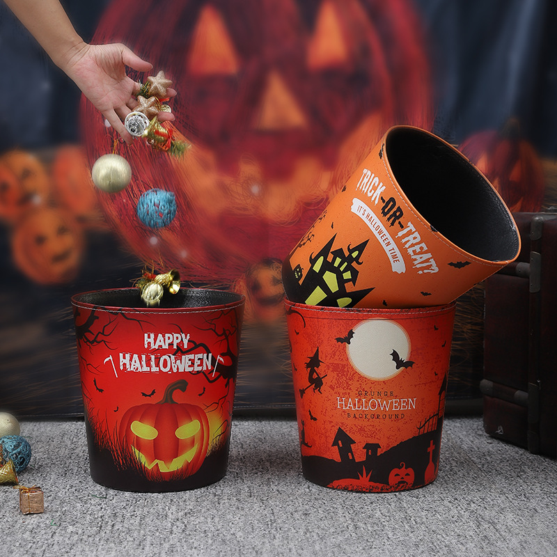 新款万圣节皮革垃圾桶节日氛围派对装饰收纳桶家用圆形无盖垃圾篓