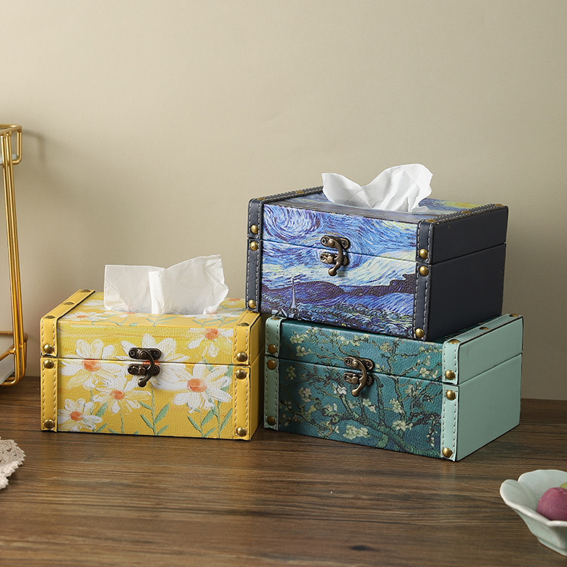 创意星空纸巾盒油画风皮革木质抽纸盒家用客厅茶几餐桌纸巾收纳盒