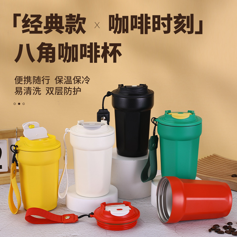 网红316不锈钢八角咖啡杯户外便携吊带保温杯男女情侣真空随行杯