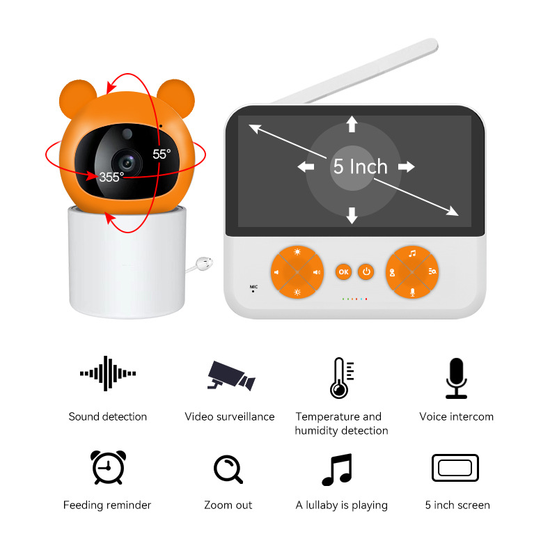 跨境5寸显示屏婴儿监视器语音对讲视频355°家用监控720P高清视频