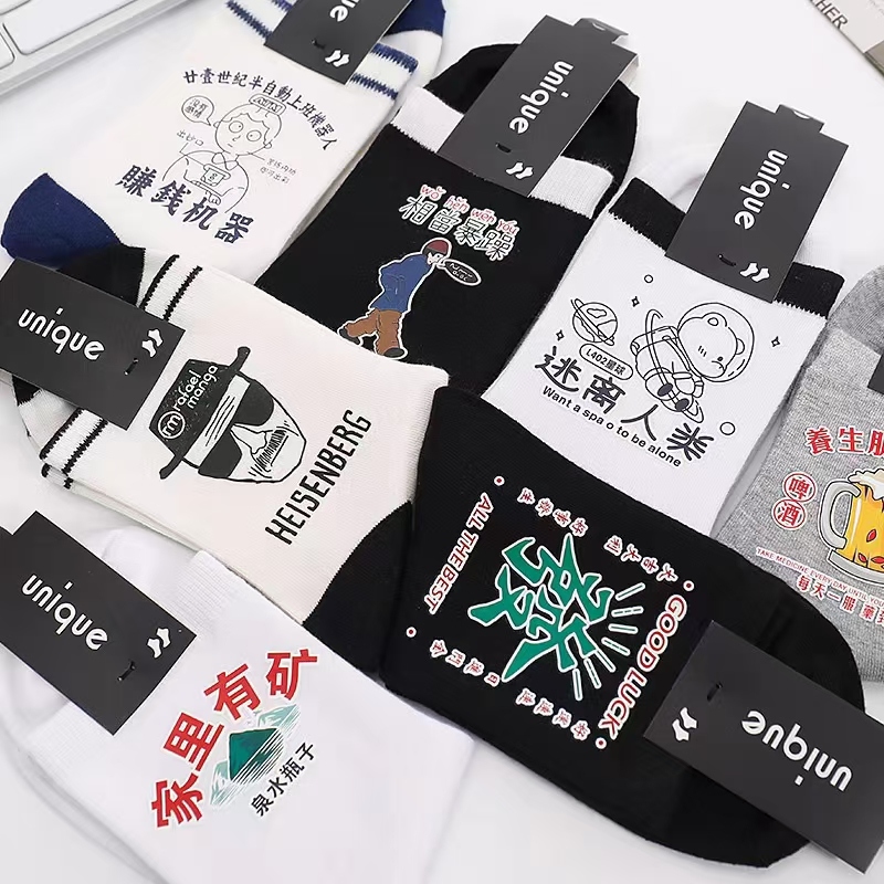 秋冬新款中筒袜ins潮时尚韩个性运动男士黑白复古烫画情侣袜男袜