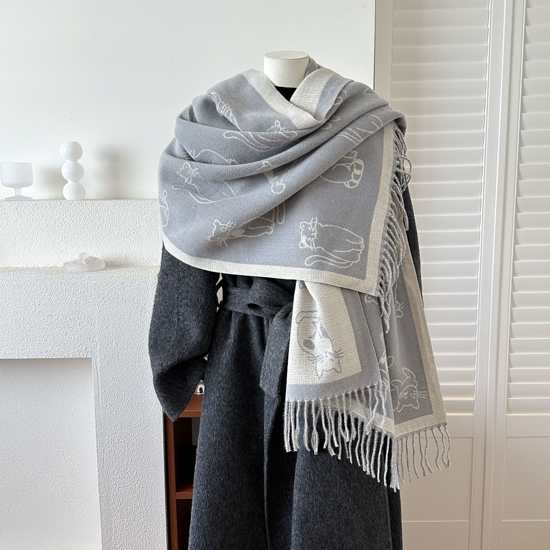 可爱猫咪提花仿羊绒围巾女冬季韩版百搭双面保暖加厚披肩男送礼物