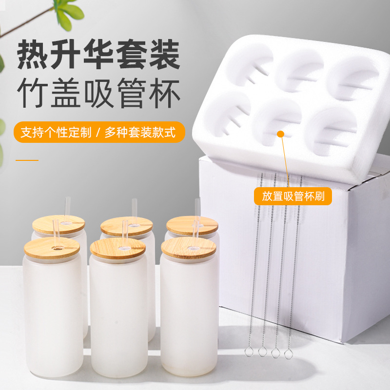 16oz玻璃可乐杯热升华玻璃饮品冷饮果汁奶茶杯竹盖玻璃杯六件套装