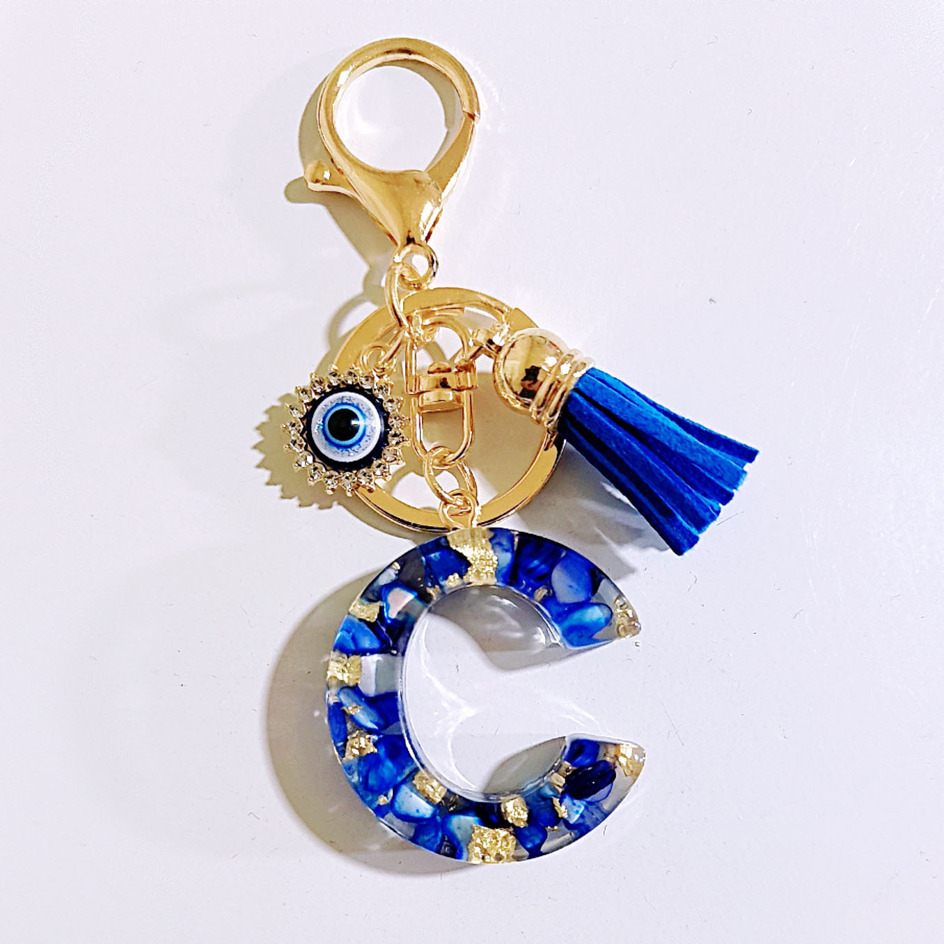 跨境新款宝蓝色恶魔之眼流苏款式26个英文字母钥匙扣女士包包挂饰