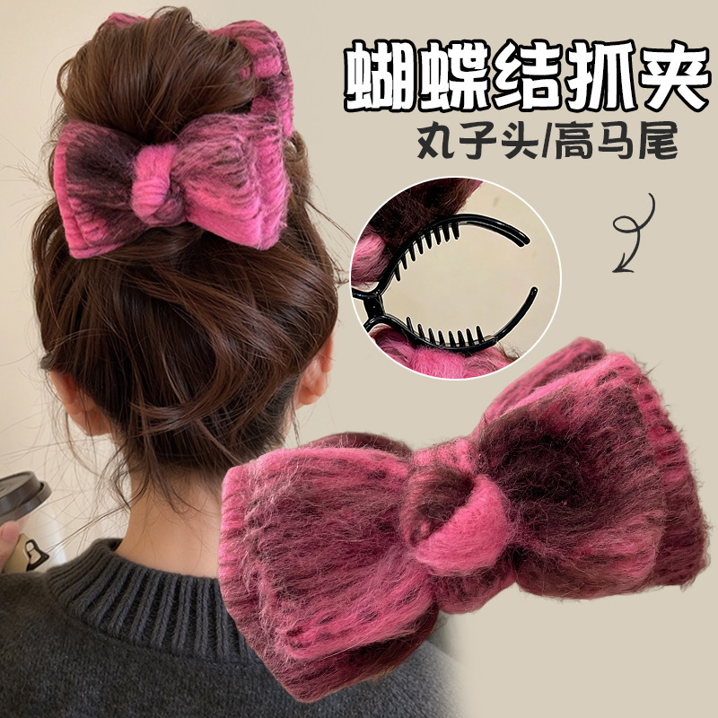 秋冬毛绒蝴蝶结丸子头的抓夹女高级感2025新款发夹后脑勺鲨鱼夹子