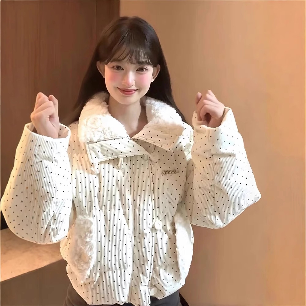 拼接设计感小众波点棉服上衣女冬季甜美可爱羊羔毛翻领外套棉衣韩