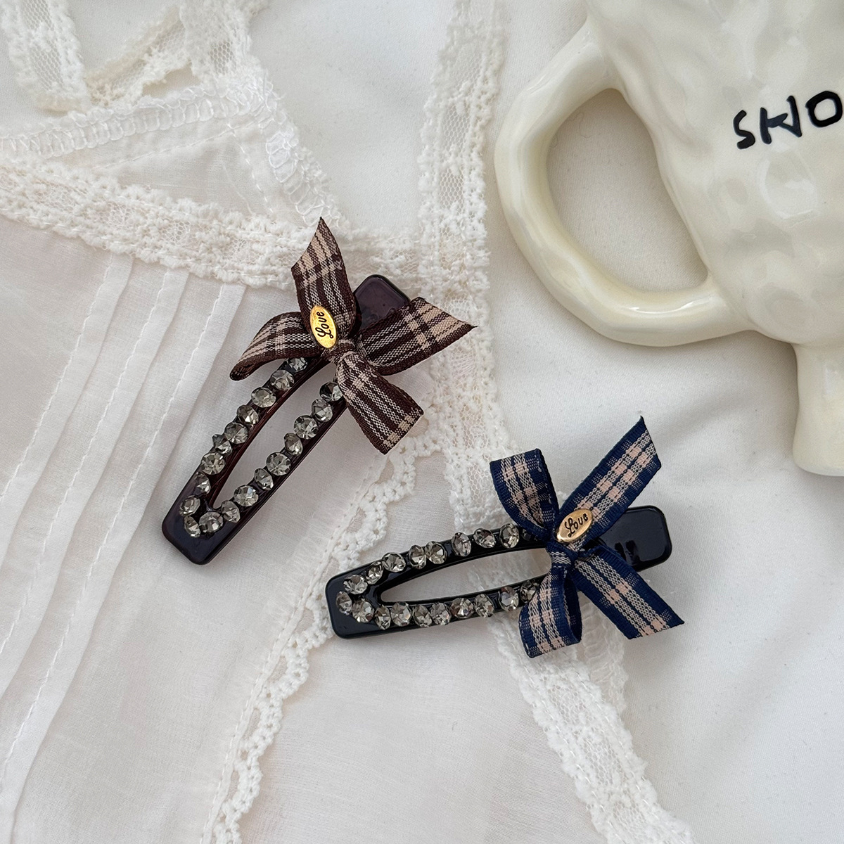 镂空甜美布艺蝴蝶结水钻格子侧边发夹女可爱复古马尾夹刘海夹头饰