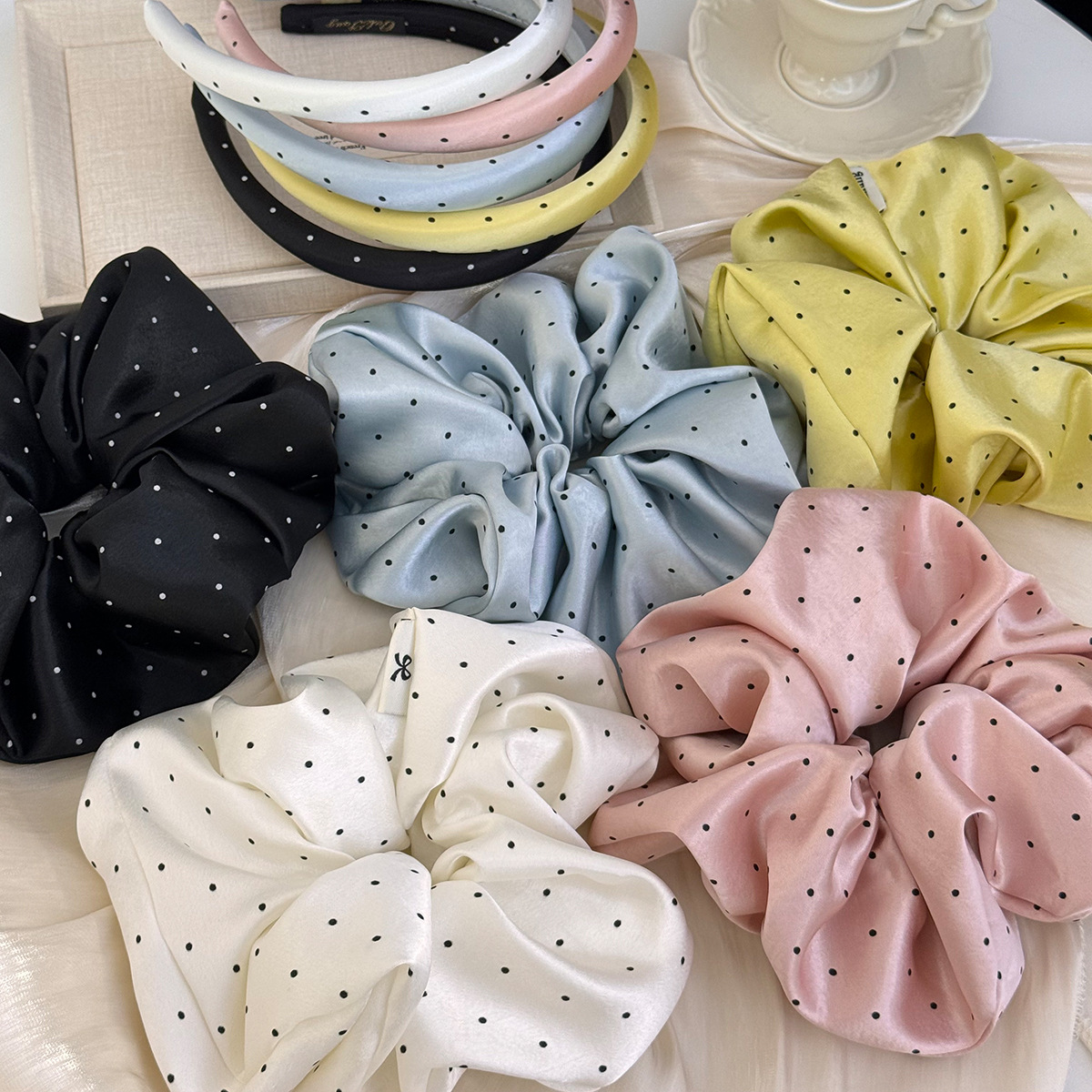 甜美蓝色缎面时尚大肠发圈法式黑白波点低马尾头绳丸子头发箍发圈