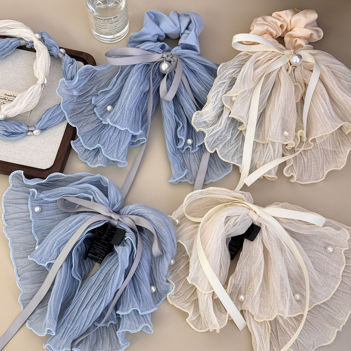 韩版人鱼裙摆层蕾丝褶皱网纱珍珠蝴蝶结大肠圈清新甜美扎马尾发圈