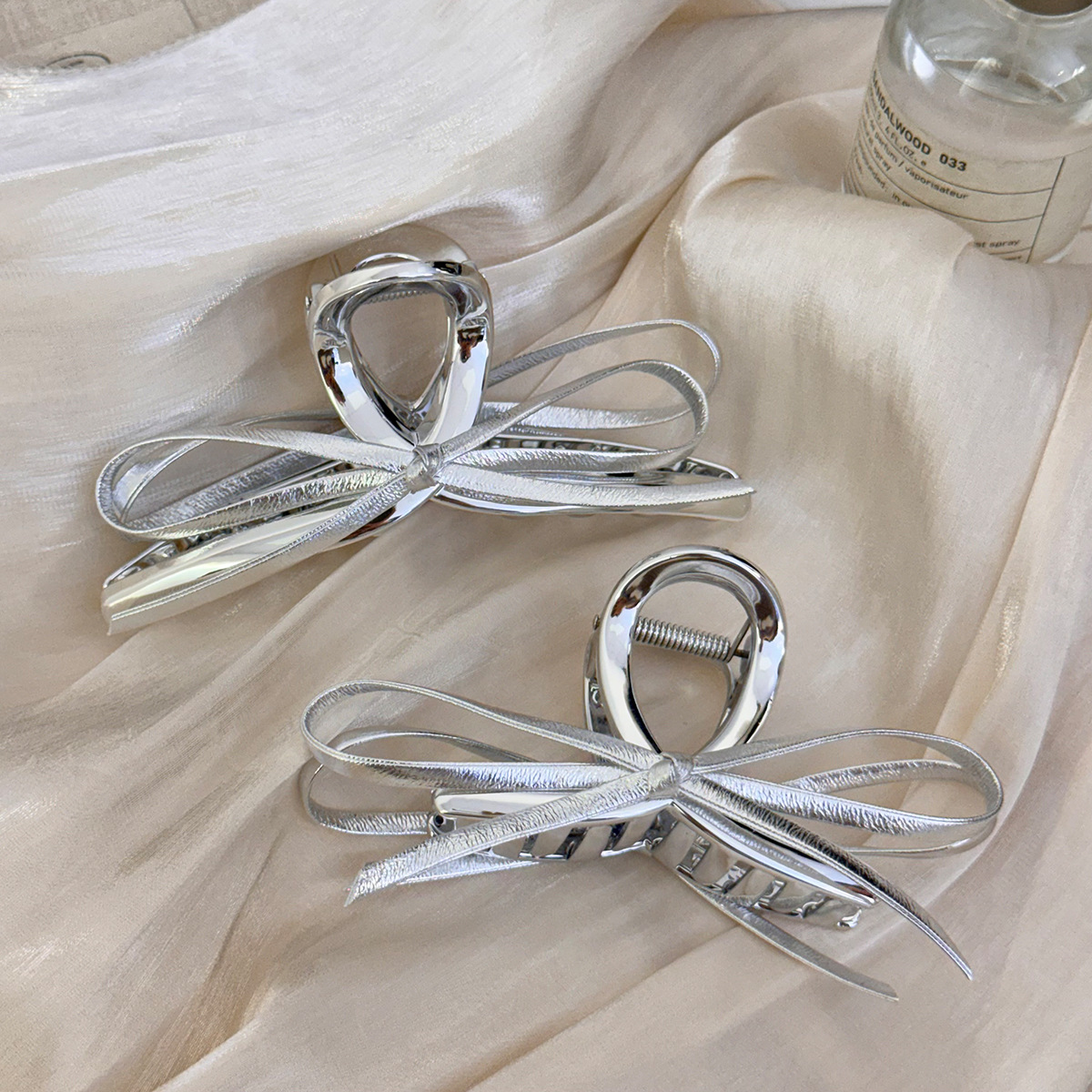 甜酷设计感银色蝴蝶结皮质抓夹女2025新款高级感发夹鲨鱼夹子发饰
