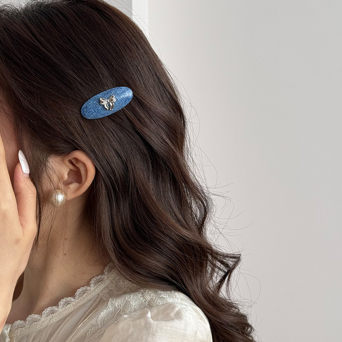 韩国欧尼博主同款亮银色蝴蝶结牛仔蓝色边夹少女感鸭嘴夹刘海发夹