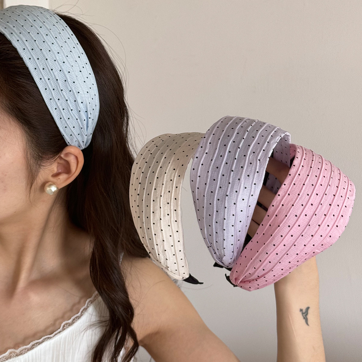 法式发箍头箍清新发饰褶皱压发外出2025年波点雪纺顶发卡高颅宽边