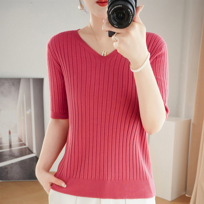 2025年新款百搭短袖T恤修身抽条女士针织衫显瘦款打底内搭外穿