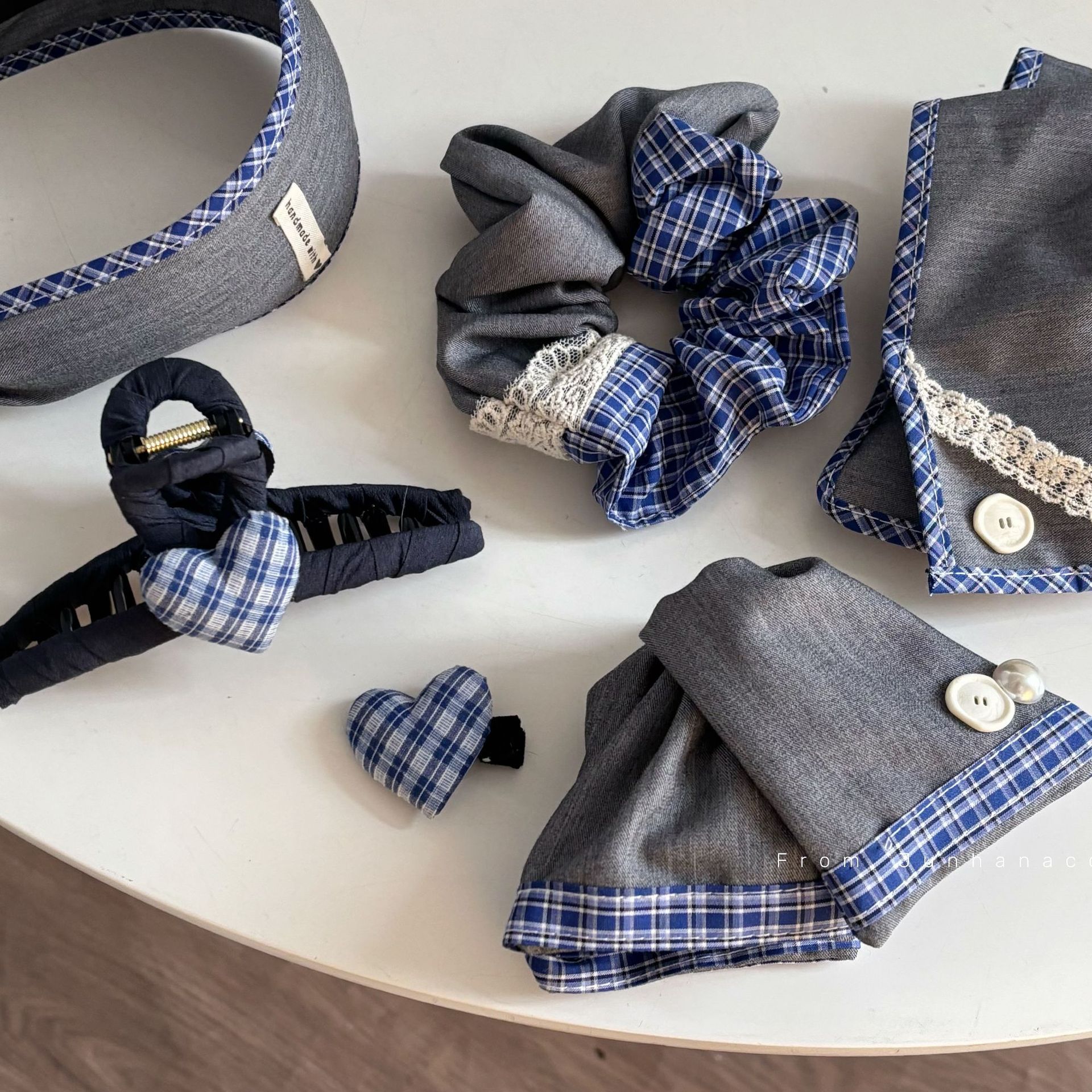 蓝灰拼接蕾丝格纹发夹布艺大肠发圈高级感扎头绳百搭发箍抓夹发饰