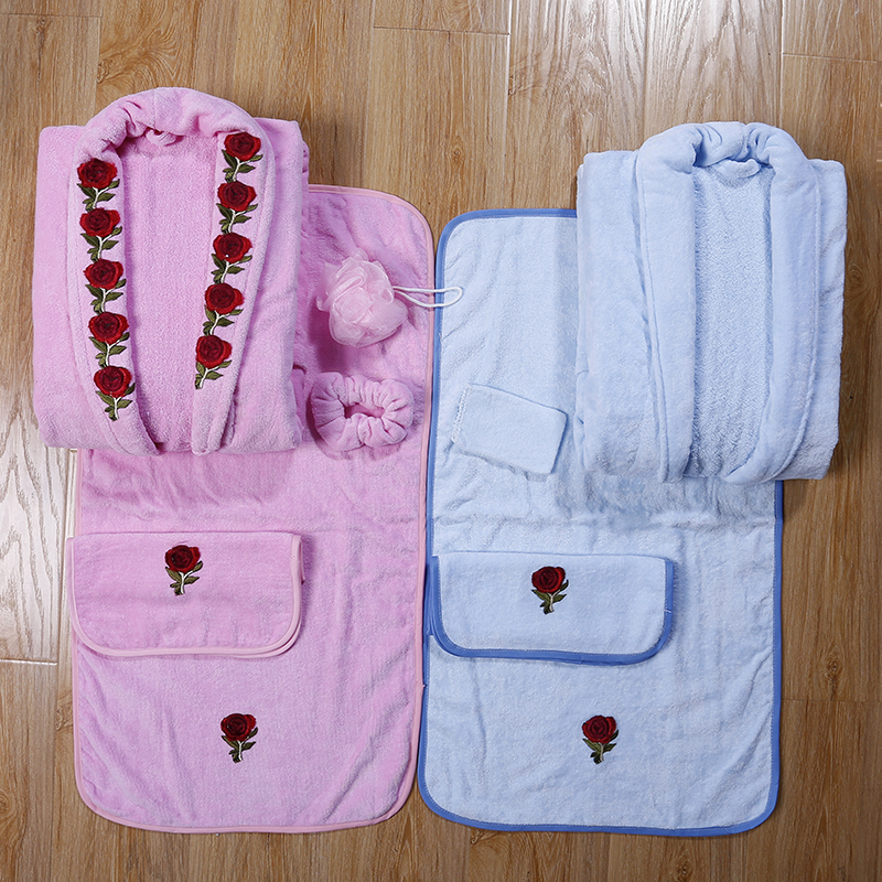 高档纯棉浴衣浴袍套装(2件浴袍、大毛巾、小毛巾、拖鞋、浴球)
