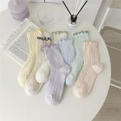 24新款日系甜美纯色木耳边堆堆女袜子春夏薄款网眼中筒袜现货批发