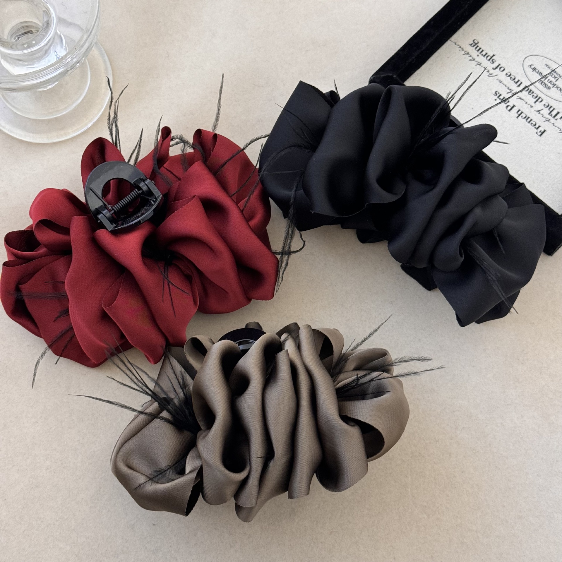 缎面羽毛抓夹女2024新款法式优雅气质高级感半扎发鲨鱼夹盘发发饰