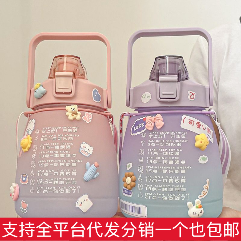 大号容量水杯子女带吸管时间刻度2000ml运动网红夏季水瓶塑料水壶