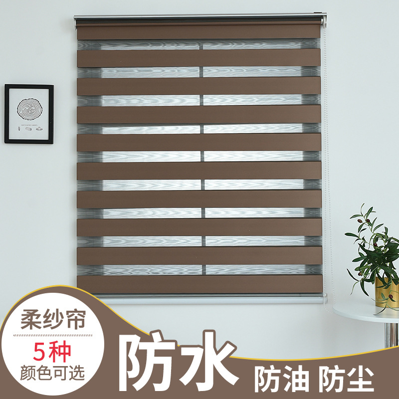 黑金全遮光柔纱帘手动拉绳升降布艺窗帘条纹素色卷帘成品定制防水