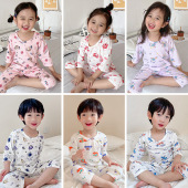 儿童夏季无骨睡衣套装纯棉七分袖空调服男女中小童薄款透气家居服
