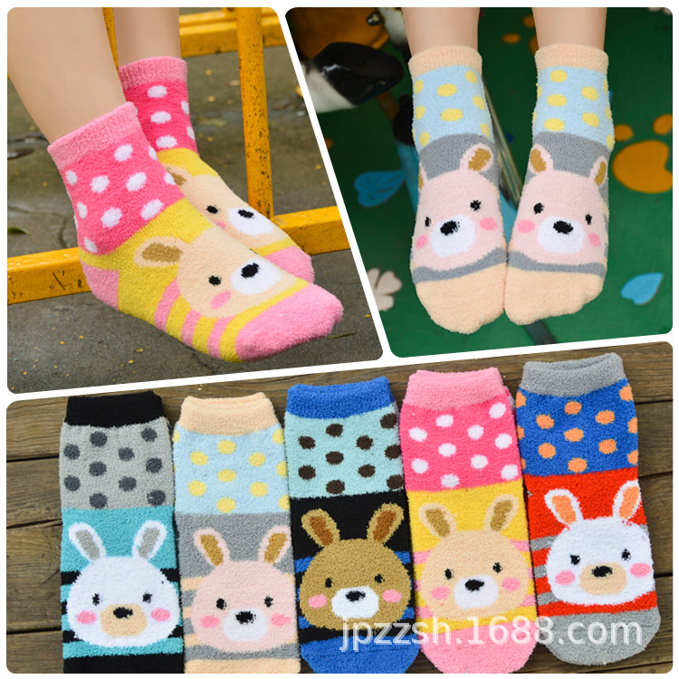 新款珊瑚绒直板卡通女袜 圆点小兔子加厚毛绒袜 保暖睡眠毛巾袜