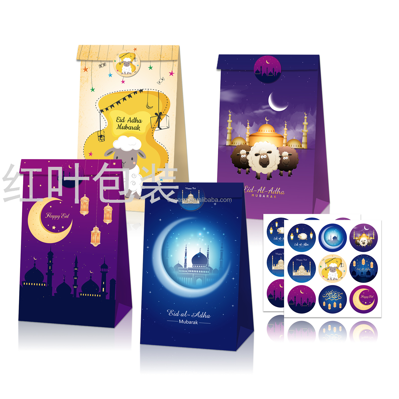 批发定制 穆斯林 EID AL-Adha 牛皮纸糖果包装礼品袋 带贴纸
