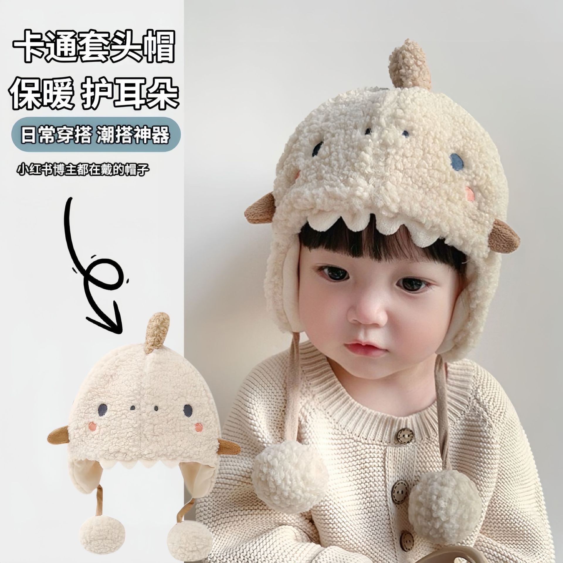 秋冬季宝宝毛绒帽男女儿童可爱超萌护耳帽保暖防风套头帽婴儿帽子
