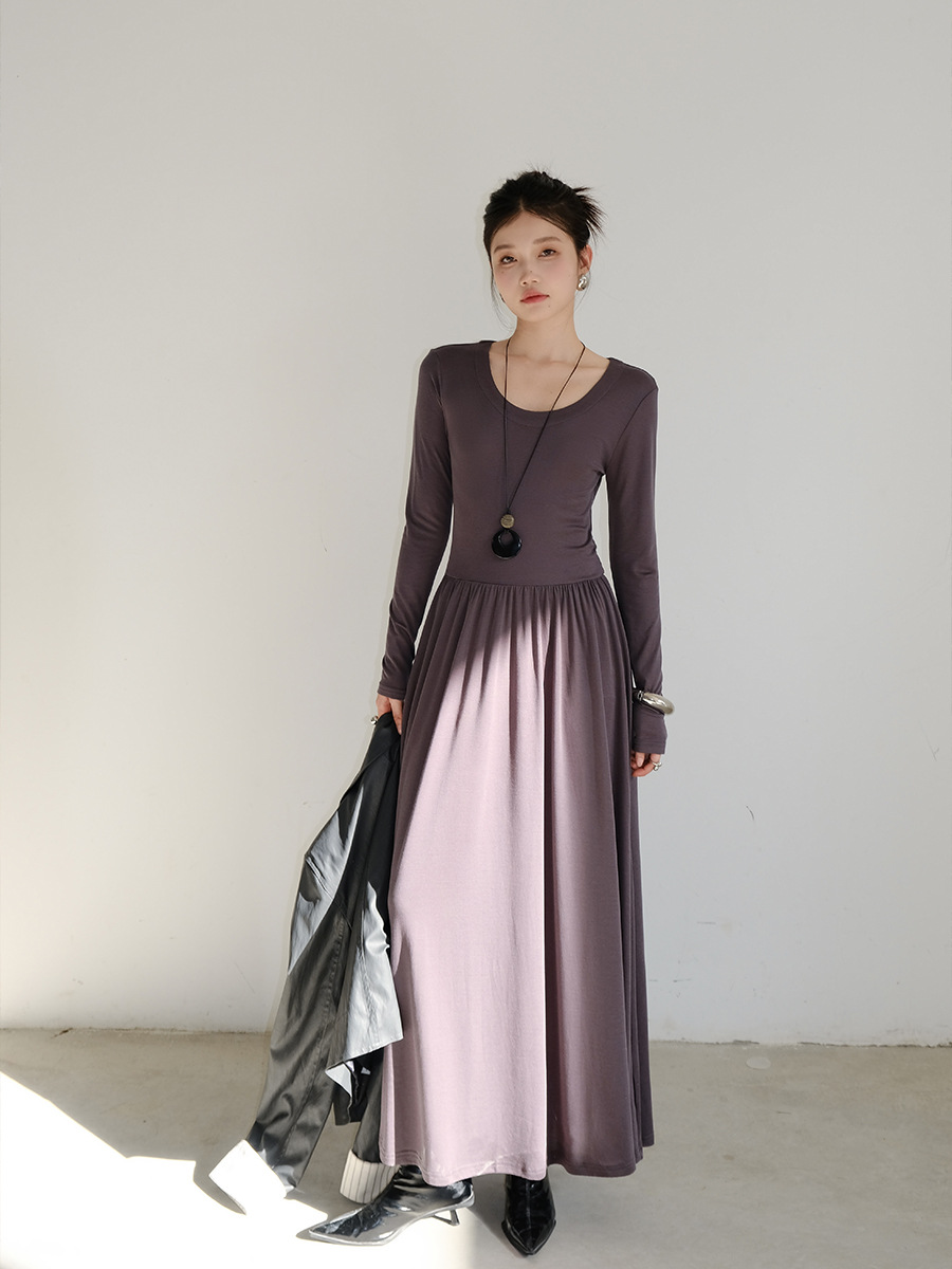 2025秋季新款复古简约U字领针织拼接修身A型连衣裙28775