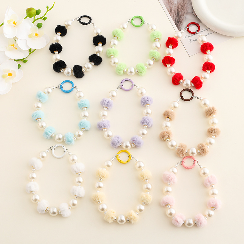 新款毛球串珠手机链diy女生包包挂饰清新时尚珍珠钥匙扣挂链批发