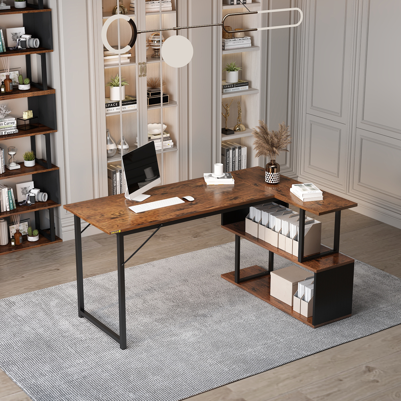 跨境专供转角电脑桌开放式储物空间书桌带LED灯办公桌家用老板桌