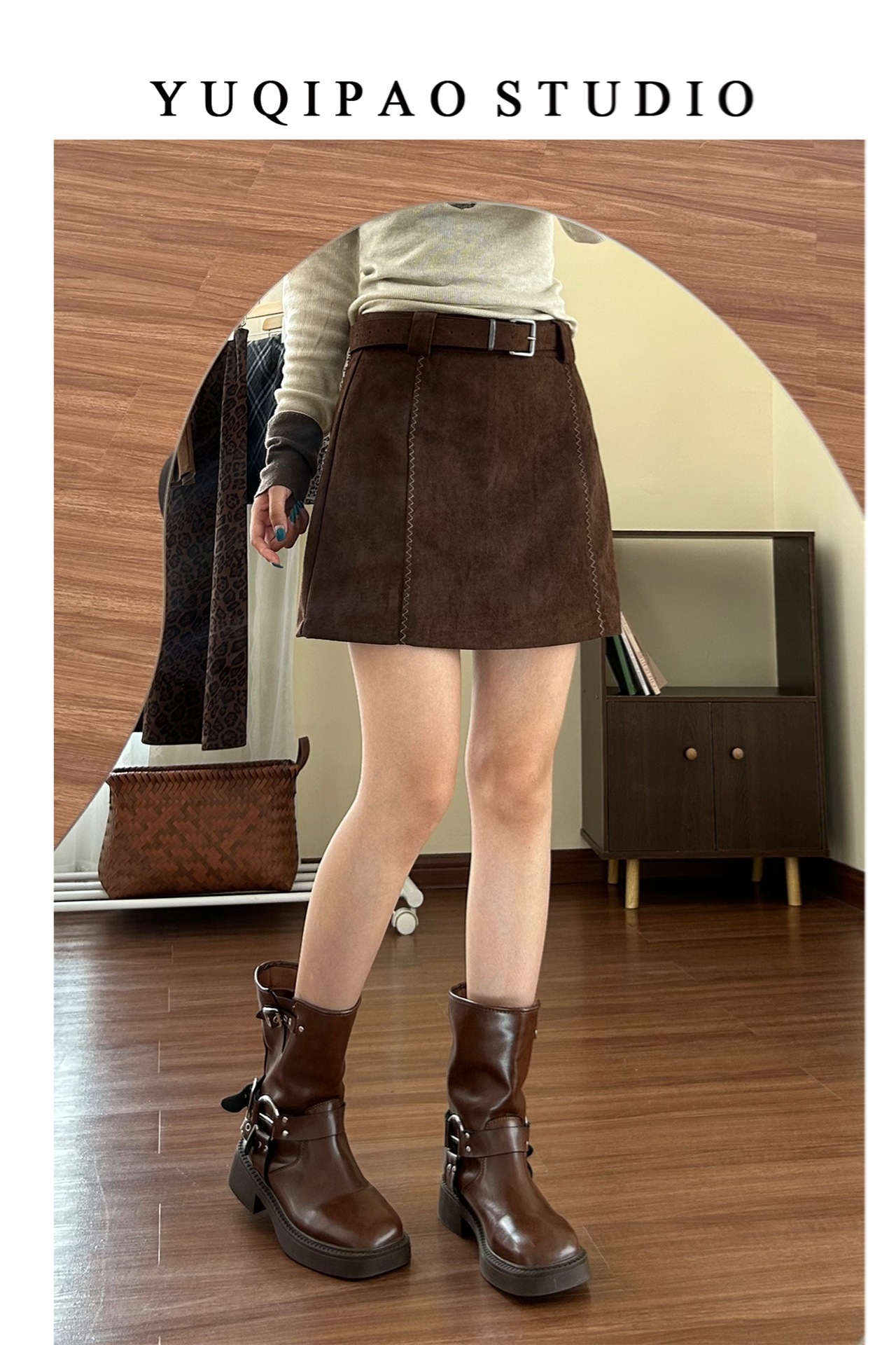 大码胖mm咖色麂皮绒半身裙女秋冬季微胖短裙子高腰棕色a字包臀裙