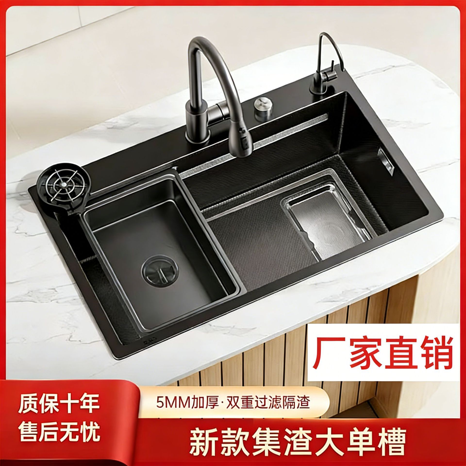 蜂窝鲨鱼5MM瀑布智能数显按键米粒压纹特厚不锈钢三合一厨房水槽