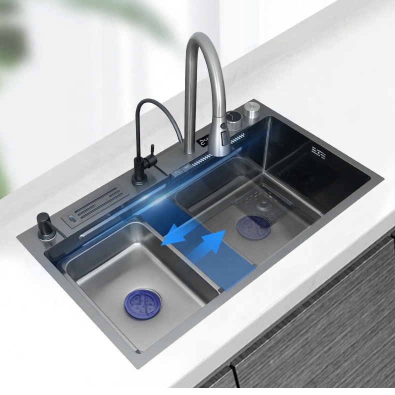 智能飞雨水槽数显刀架瀑布大单槽厨房纳米洗菜盆日式不锈钢洗碗池