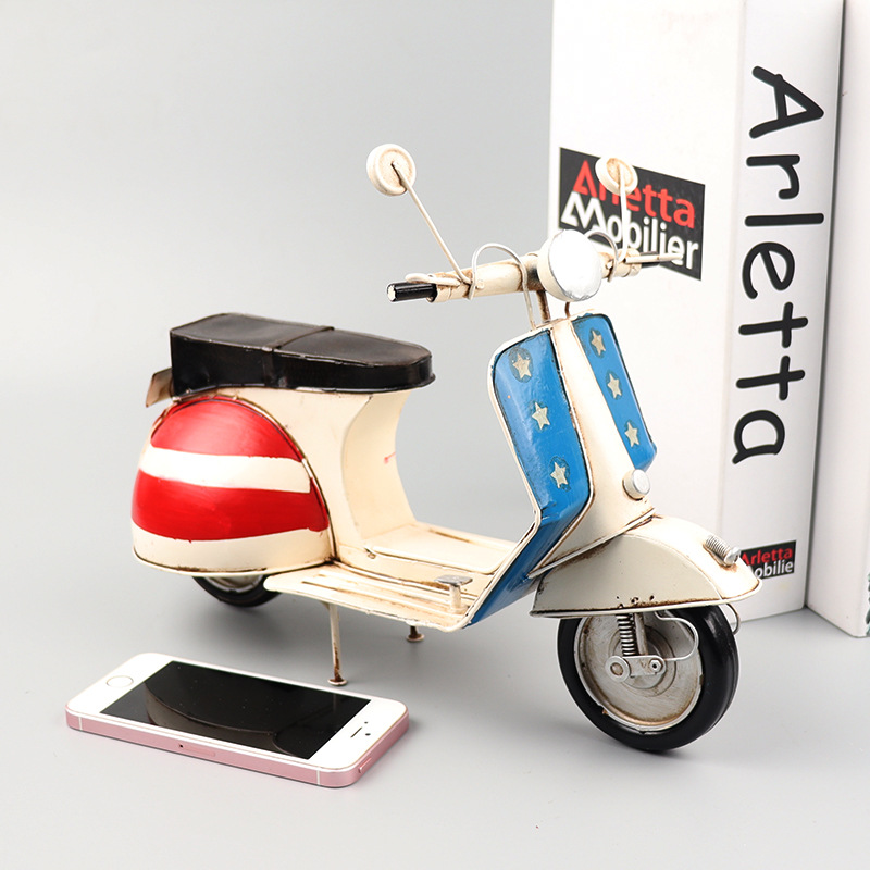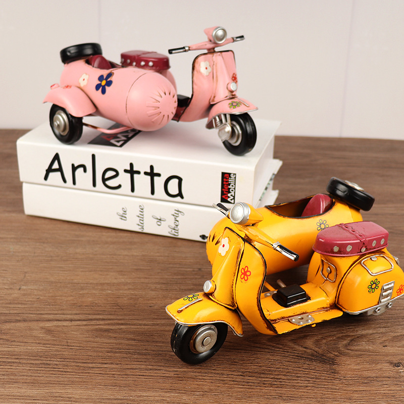 VESPA三轮摩托车模型铁皮挎斗偏三轮小踏板创意手工艺品装饰摆件