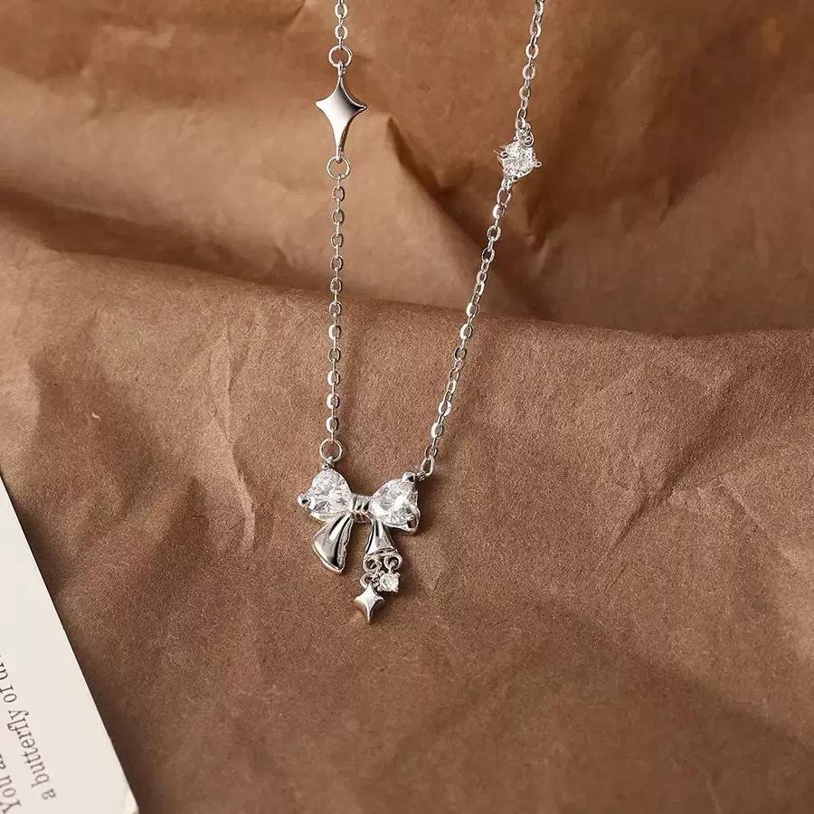 S999小众设计银色蝴蝶结锆石项链气质简约百搭个性轻奢锁骨链女友