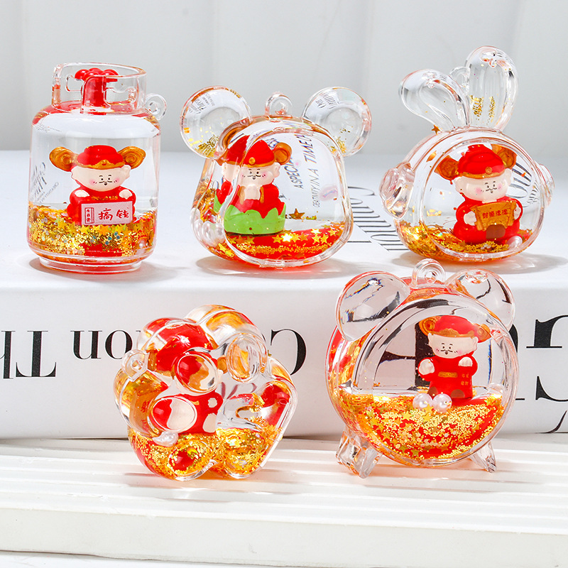 2024新年款红金财神摆件入油流沙瓶配件亚克力钥匙扣包包挂件批发