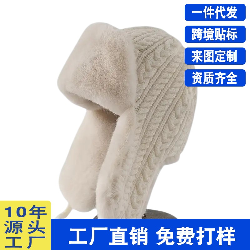毛线雷锋帽女冬季韩版百搭毛绒加厚保暖护耳帽绑绳设计御寒包头帽