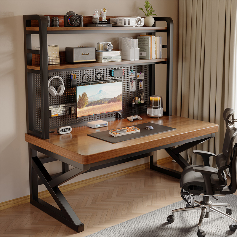 实木电脑桌卧室家用台式电竞桌学生学习桌洞洞板书桌书架一体桌子