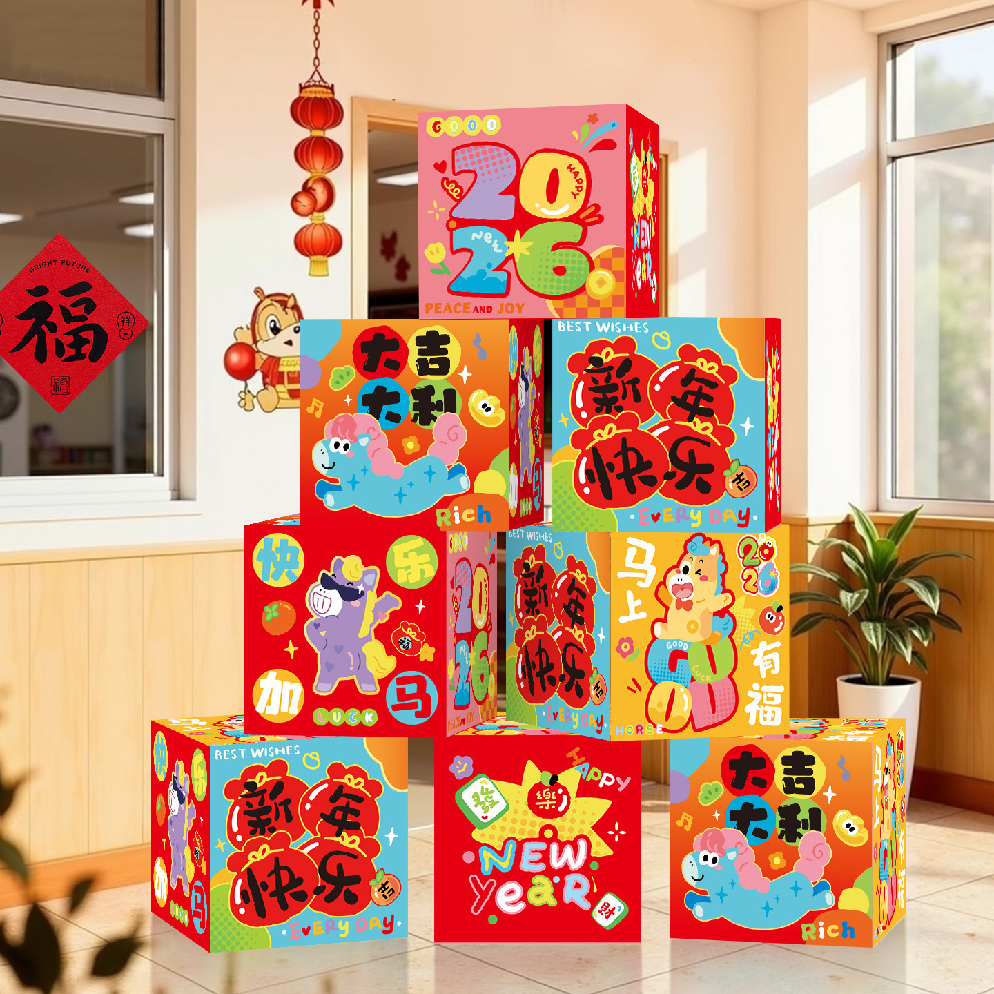 2026新年堆头春马年氛围场景布置装饰地堆盒子节学校商场店铺摆件
