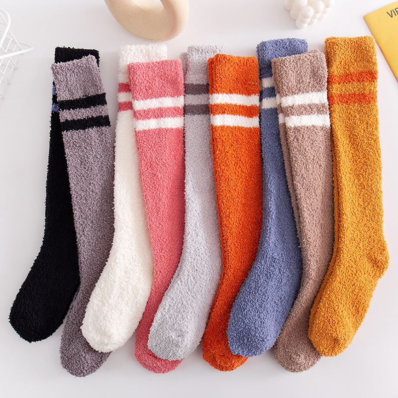 半边绒袜子秋冬珊瑚绒二杠小腿袜家居保暖地板ins亲肤长筒袜订做