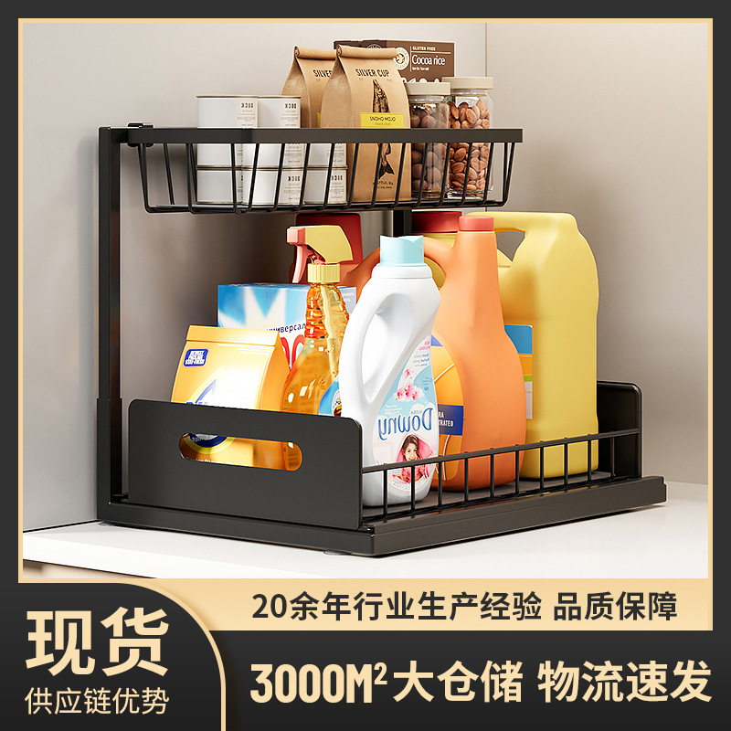 跨境厨房抽拉式置物架橱柜内分层下水槽调料杂物收纳筐拉篮抽屉式