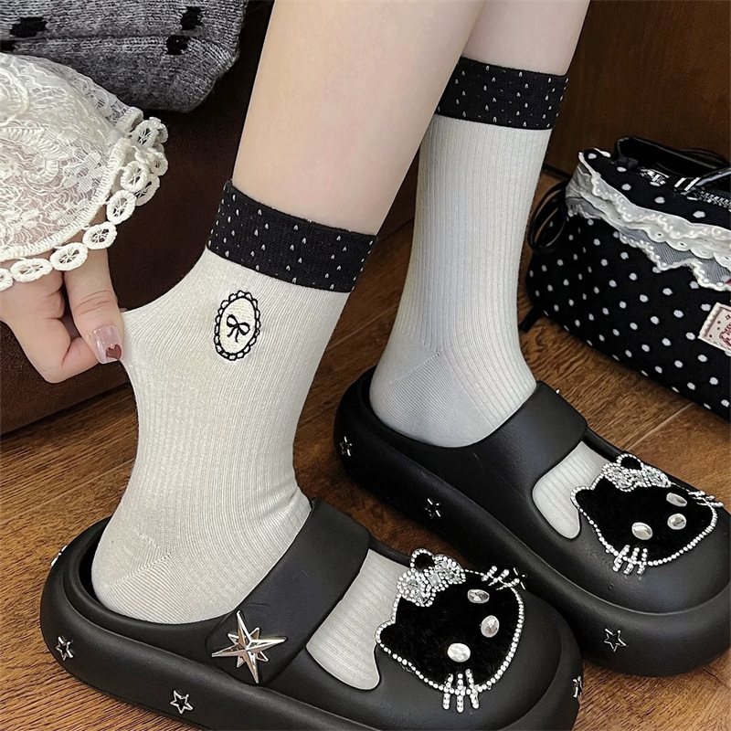 复古点点撞色蝴蝶结刺绣袜子女中筒袜ins潮纯棉日系jk堆堆长袜