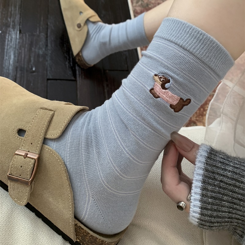 新款刺绣腊肠狗韩版中筒薄棉袜子细条纹腊肠狗基础百搭棉袜ins风